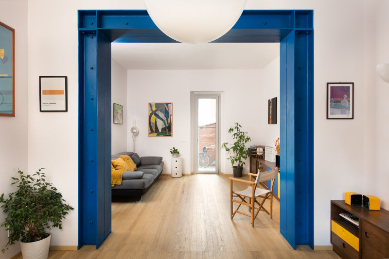 Separate infatti da un muro portante, è stato necessario l’intervento di un ingegnere strutturista che calcolasse per il varco richiesto le dimensioni delle travi di acciaio atte a sostenerlo. A testimoniarne la trasformazione, il portale metallico è stato lasciato a vista , anzi, messo in evidenza da una tinta azzurro intenso.