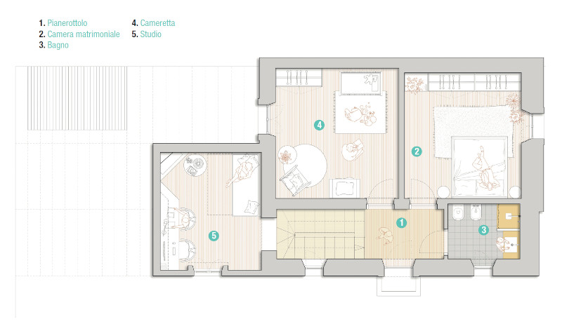 La distribuzione del piano superiore dedicato alla zona notte è rimasta sostanzialmente invariata, fatto salvo il completo rifacimento dei bagni che, seppur mantenuti nella stessa posizione, articolano ora i diversi ambiti del relax in modo originale. Due le camere da letto, una padronale e una in previsione di avere figli, uno studio e un bagno.