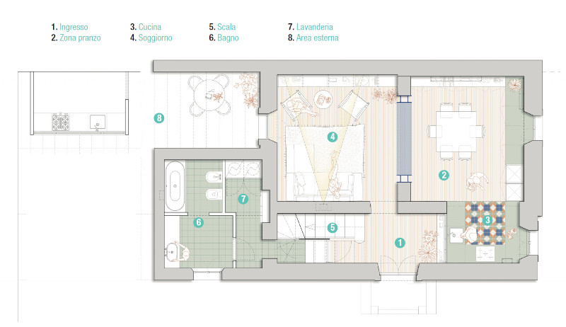 La cucina è uno spazio creativo che l’uso di colori accesi connota in maniera decisa, trasformando oggetti e parti funzionali in elementi di arredo dal segno forte: un mobile cucina con ante in legno laccate verde acqua si sviluppa a ferro di cavallo in una zona di lavoro affacciata sull’ingresso, per poi prolungarsi verso l’area pranzo attraverso due colonne, frigorifero e forno, pensate, in virtù della loro esposizione sul soggiorno, come elementi d’arredo.