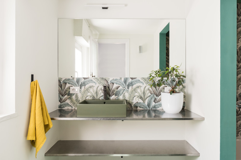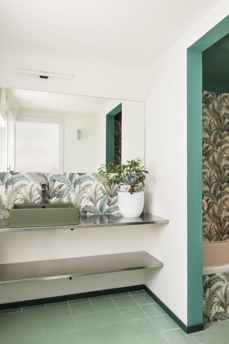 Il rivestimento, appena accennato dietro al lavabo e dominante nella zona dei sanitari, è in gres porcellanato e raffigura una fitta vegetazione tropicale, “rimando al giardino esterno”. La zona contiene anche un piccolo locale adibito a lavanderia.