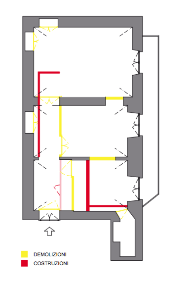 L’abitazione presentava una struttura molto rigida con un buio corridoio d’entrata che distribuiva i tre spazi principali isolandoli in se stessi senza soluzione di continuità.