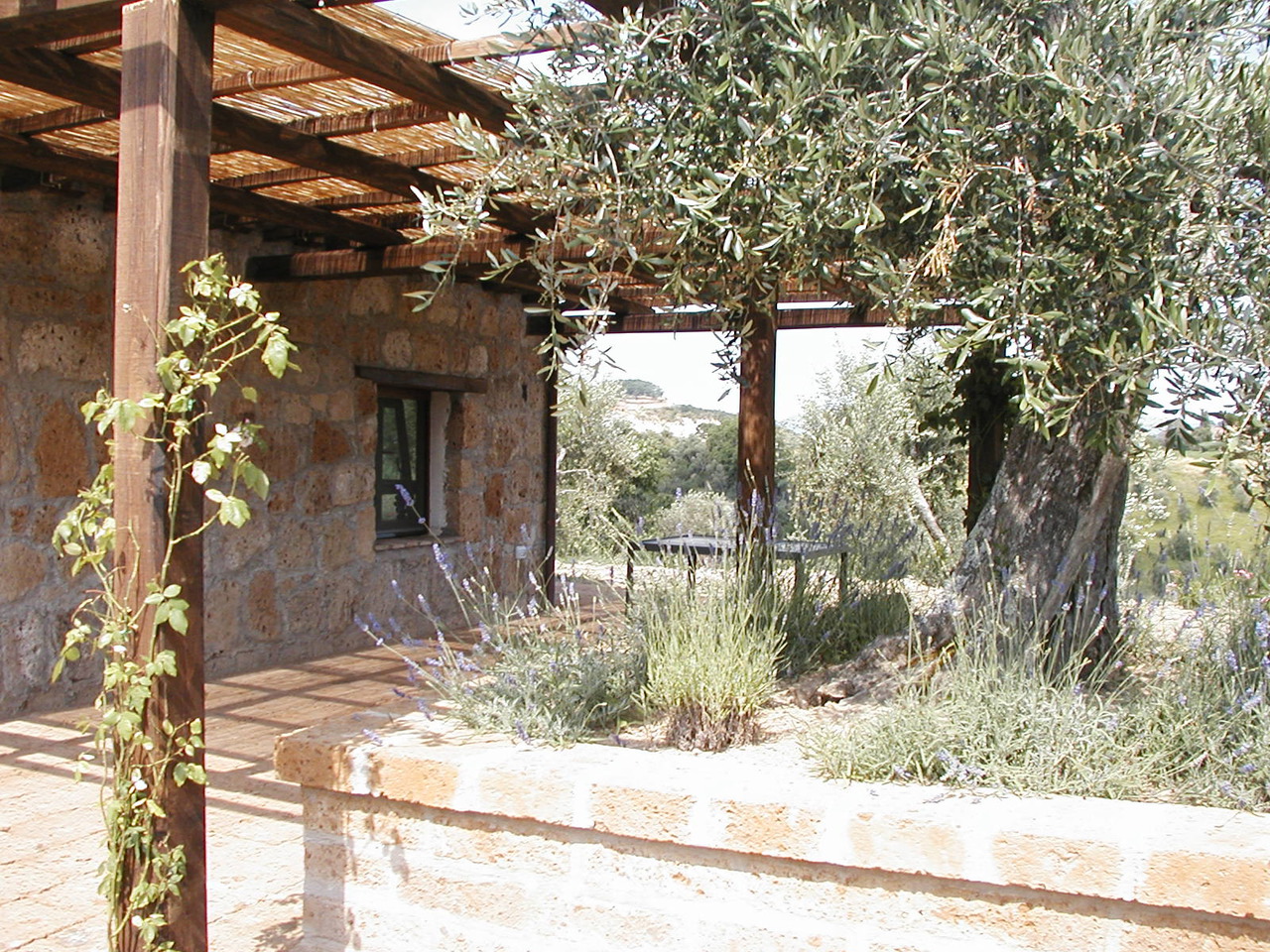 Nella parte terminale della costruzione, sostanzialmente a pianta rettangolare, l’architetto è riuscito, giocando con le altezze, a ricavare una zona di servizio nella parte bassa e parzialmente interrata e una zona notte a soppalco; la zona giorno si trova così a una quota intermedia alle due precedenti. La camera da letto è posizionata a una quota rialzata rispetto al soggiorno su cui affaccia (+1,60 metri), una sorta di arredo fisso sul sottostante locale bagno. il piano di calpestio, così come le armadiature e il “banco” rialzato che funge da comodino, è costituito da travetti e tavolati di legno massello di castagno. Anche la rete del letto è formata da doghe della stessa essenza incassate nella struttura, così come la scala che collega la camera al soggiorno.