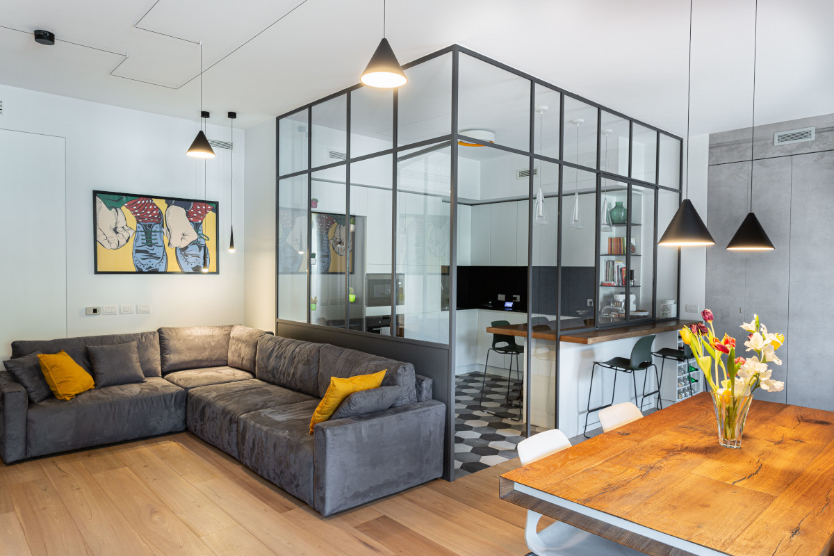 Per motivi impiantistici e di distribuzione degli ambienti, la cucina non poteva essere prevista in altra posizione, ma era richiesto che fosse fisicamente separata dal living. Bisognava però garantire i rapporti aeroilluminanti di legge: da qui l’idea di una struttura artigianale in ferro e vetro che permettesse di mantenere la cucina in relazione visiva con il living anche quando fosse completamente chiusa.