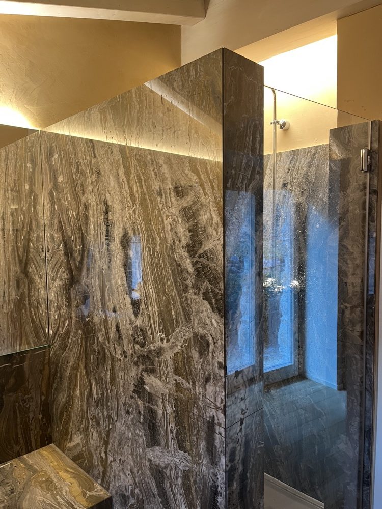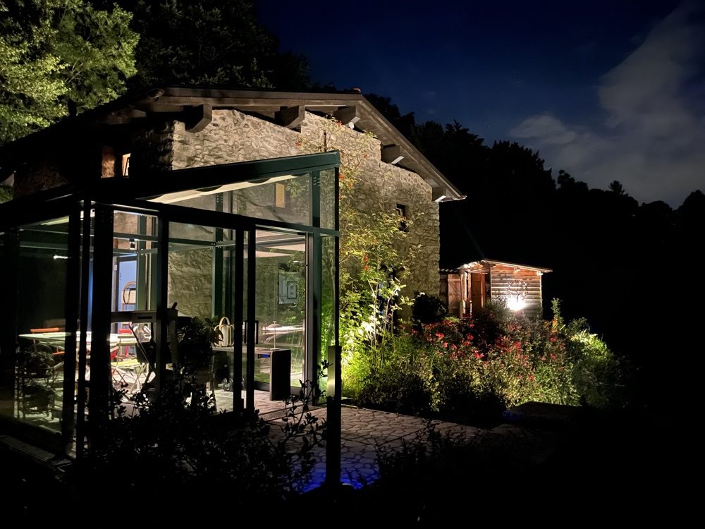 Il rustico è stato recuperato mantenendo l’aspetto esterno con le caratteristiche murature in pietra a vista, mentre l’ampliamento, su due piani, è collocato verso valle, parzialmente interrato e ideato con una copertura verde per impattare il meno possibile sul paesaggio.