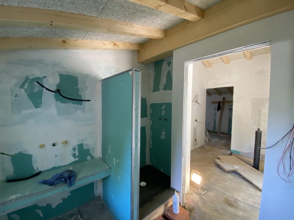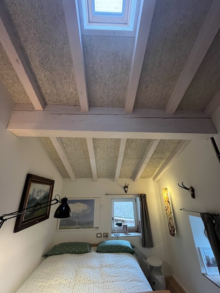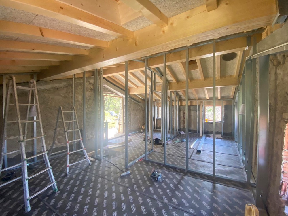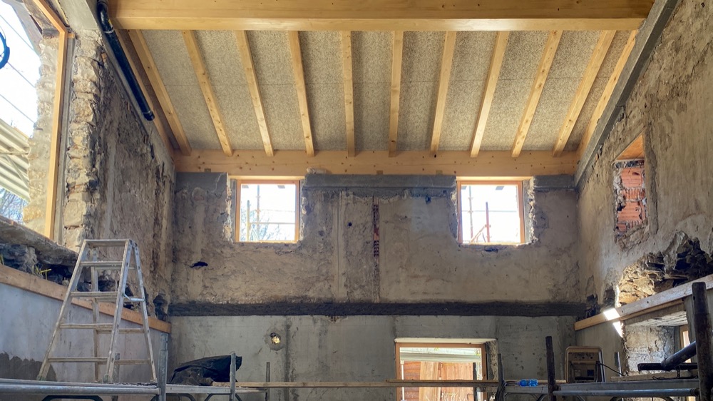 Le murature in pietra sono state isolate dall’interno: dopo la rasatura è stato posizionato uno strato impermeabile e pannelli in cartongesso (13 mm) accoppiati a lastre di poliuretano espanso rigido (dello spessore di 100 mm).
