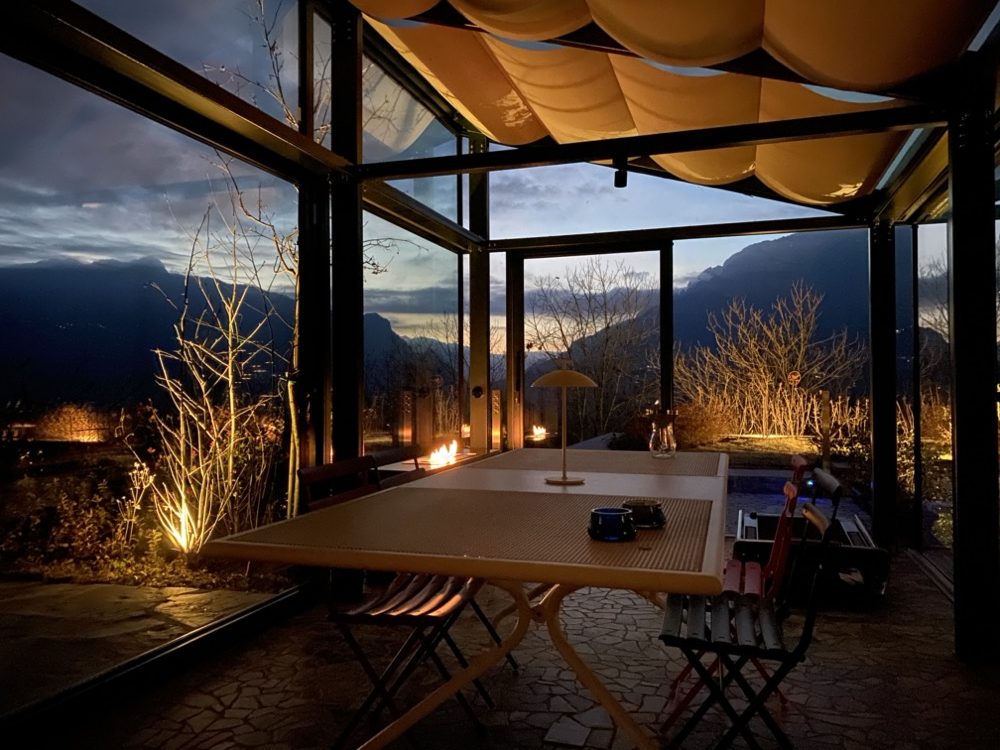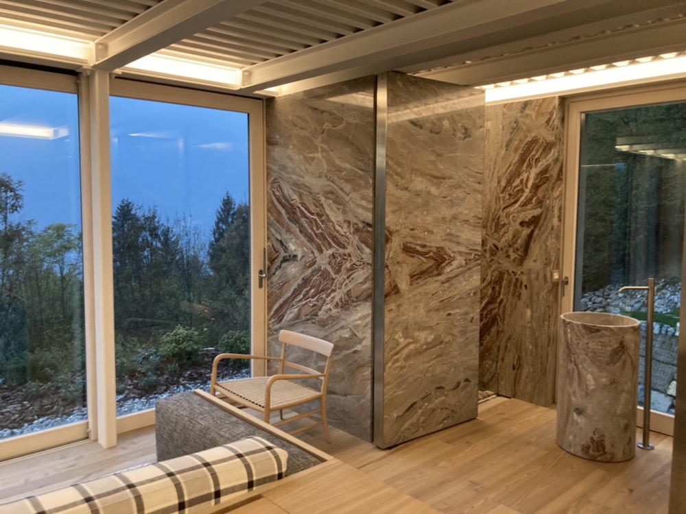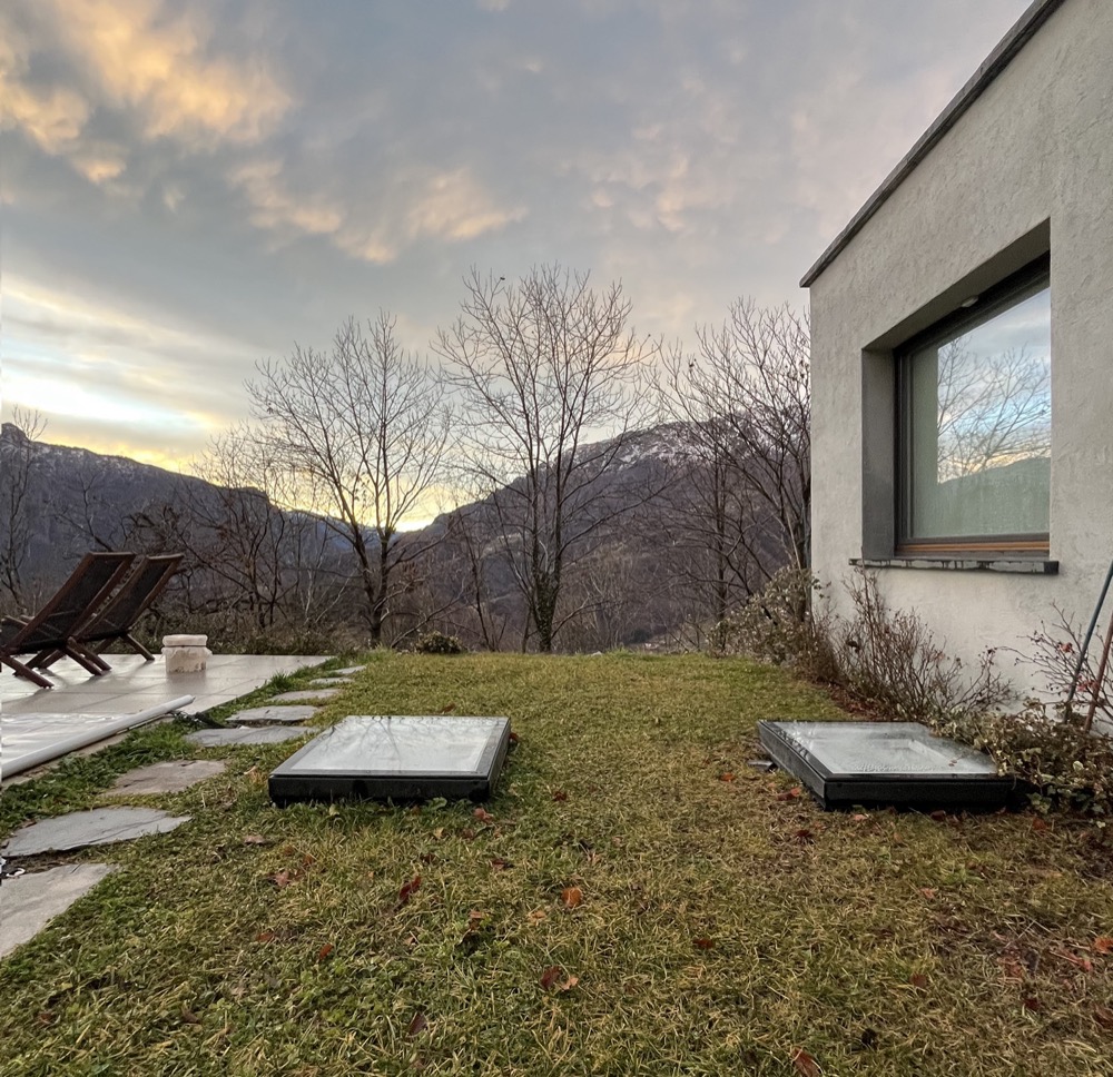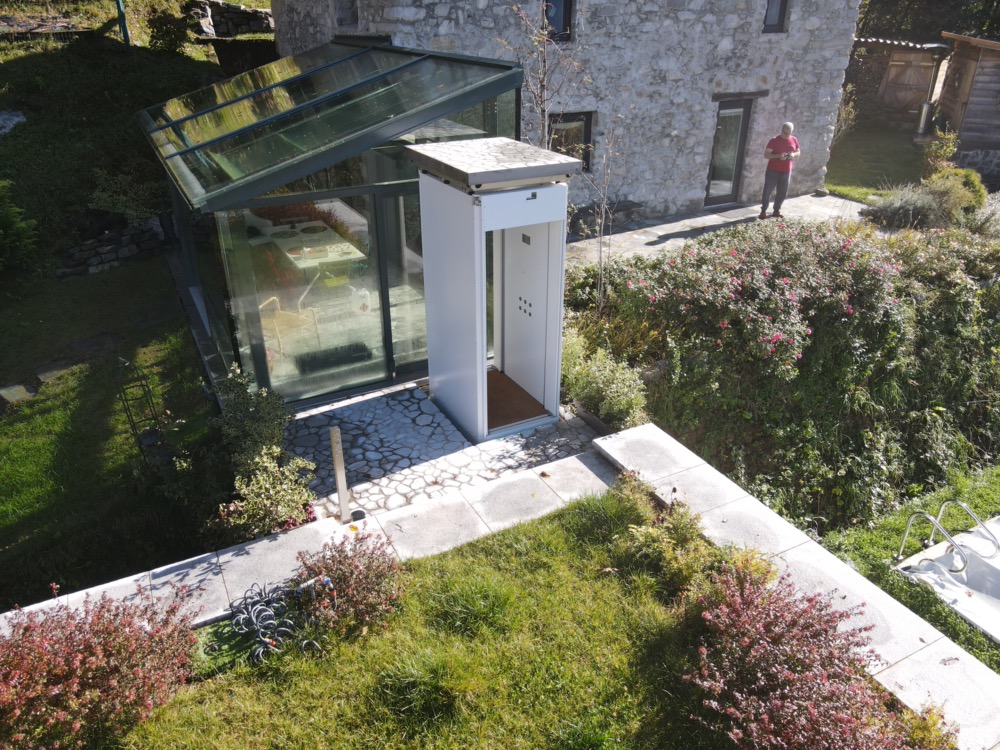 Il collegamento fra i due volumi apparentemente distaccati avviene attraverso un ascensore che rimane nascosto alla vista. L’intervento ha previsto anche la costruzione di una serra bioclimatica interamente vetrata addossata alla muratura in pietra della preesistenza; l’ascensore, a norma per disabili, emerge dal volume sottostante per trovare l’ingresso nel volume esistente proprio attraverso la serra.