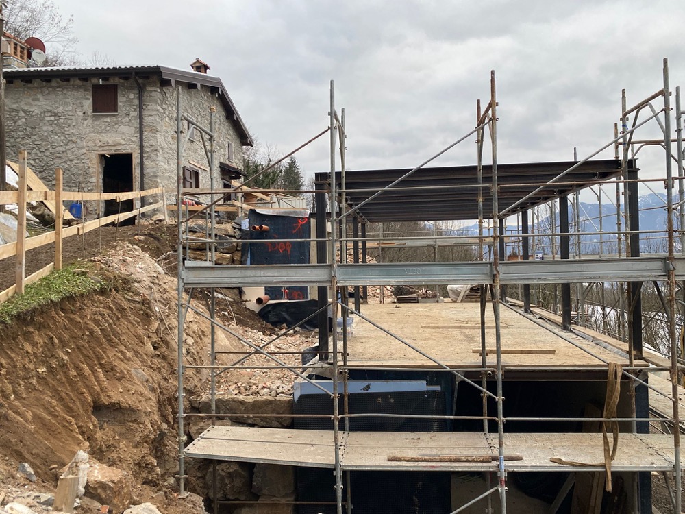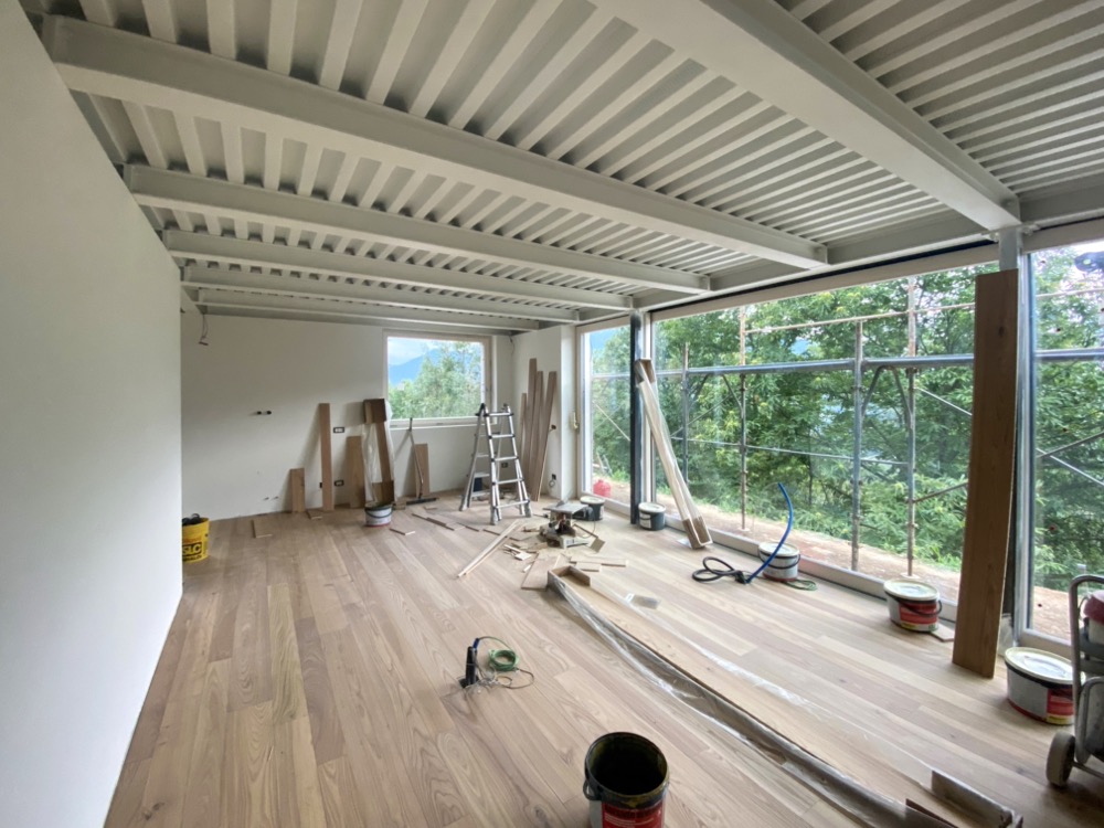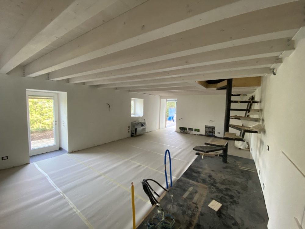 È stato necessario rifare completamente anche il solaio controterra a causa della presenza di gas radon e dell’assenza di un vespaio aerato. Alla fondazione esistente è stata aggiunta una guaina impermeabilizzante e una barriera al radon che hanno permesso di non creare un vespaio ventilato, poi è stato posato il massetto per il passaggio impianti, l’isolamento in pannelli di XPS (dello spessore di 200 mm), i pannelli per il riscaldamento radiante e il nuovo parquet.