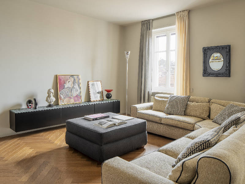 Morbidi tendaggi in lino di colore écru si bilanciano con la tinta calda delle pareti e creano una cortina continua lungo tutta la parete finestrata che volge il suo sguardo sul Monviso e il centro città. Oggetti d’arte punteggiano in modo equilibrato ogni ambiente, evidenziando il gusto della committenza ma senza appesantire gli ambienti nella nuova disposizione aperta a fluida.