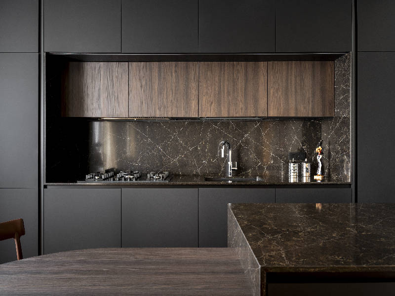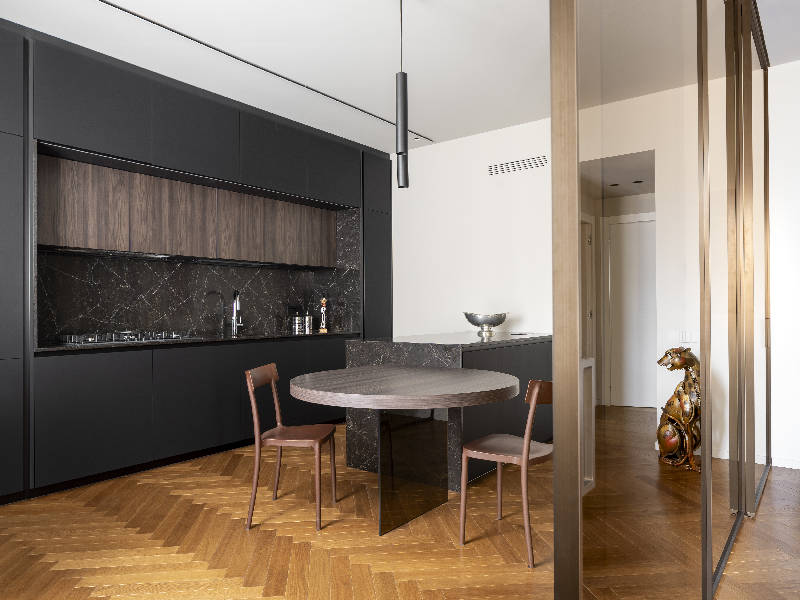 La cucina si compone di una parete attrezzata e di un’isola antistante, con un tavolo in legno tondeggiante per il pranzo e le colazioni della famiglia. La struttura di mobili, pensili e colonne è finita in vetro acidato retrolaccato nero; l’isola, l’alzata e il piano lavoro sono in marmo dalle striature bianche, mentre i pensili sopra il piano lavoro, di profondità inferiore (36 cm) sono finiti in legno.