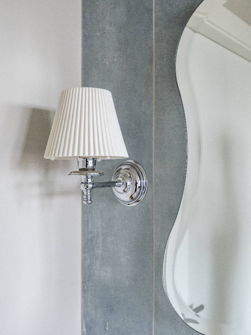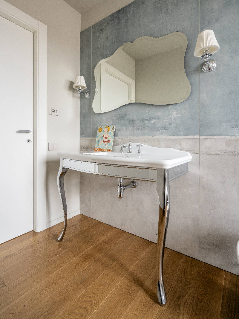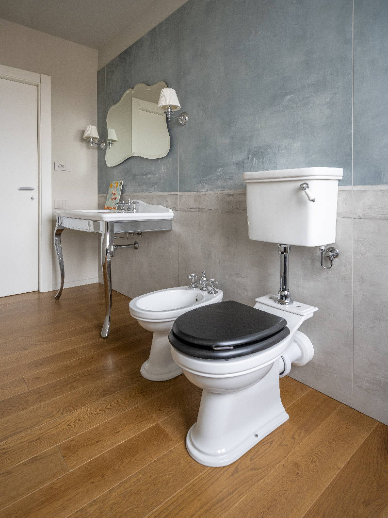 Il bagno per gli ospiti, con accesso diretto dal corridoio, ha invece un gusto classico. La texture delle piastrelle rimanda a un intonaco vecchio, un po’ usurato, e la scelta dei complementi, lavandino, bidet e water, completo di cassetta esterna, richiama esplicitamente un gusto retrò.