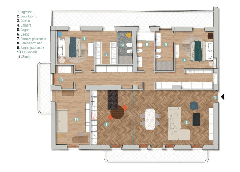 In questa porzione di appartamento il soffitto è stato ribassato per nascondere gli impianti di climatizzazione canalizzata a servizio sia della zona giorno sia della zona notte. Sul fondo del corridoio è stato ricavata una piccola lavanderia finestrata.