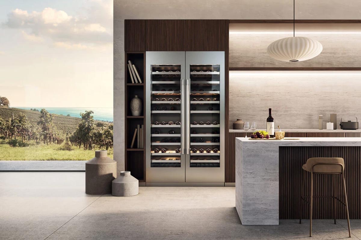La cantina vino mostrata nel video si inserisce proprio in questa logica. Il modello da 24 pollici, pari a circa 60 cm, introduce tre zone regolabili per temperatura e umidità, ripiani in legno di faggio naturale, cerniera reversibile, connessione Wi-Fi e possibilità di personalizzazione della cornice in funzione del progetto cucina. Diventa così un esempio efficace della visione SKS: conservazione professionale, controllo da remoto e attenzione al dettaglio estetico.