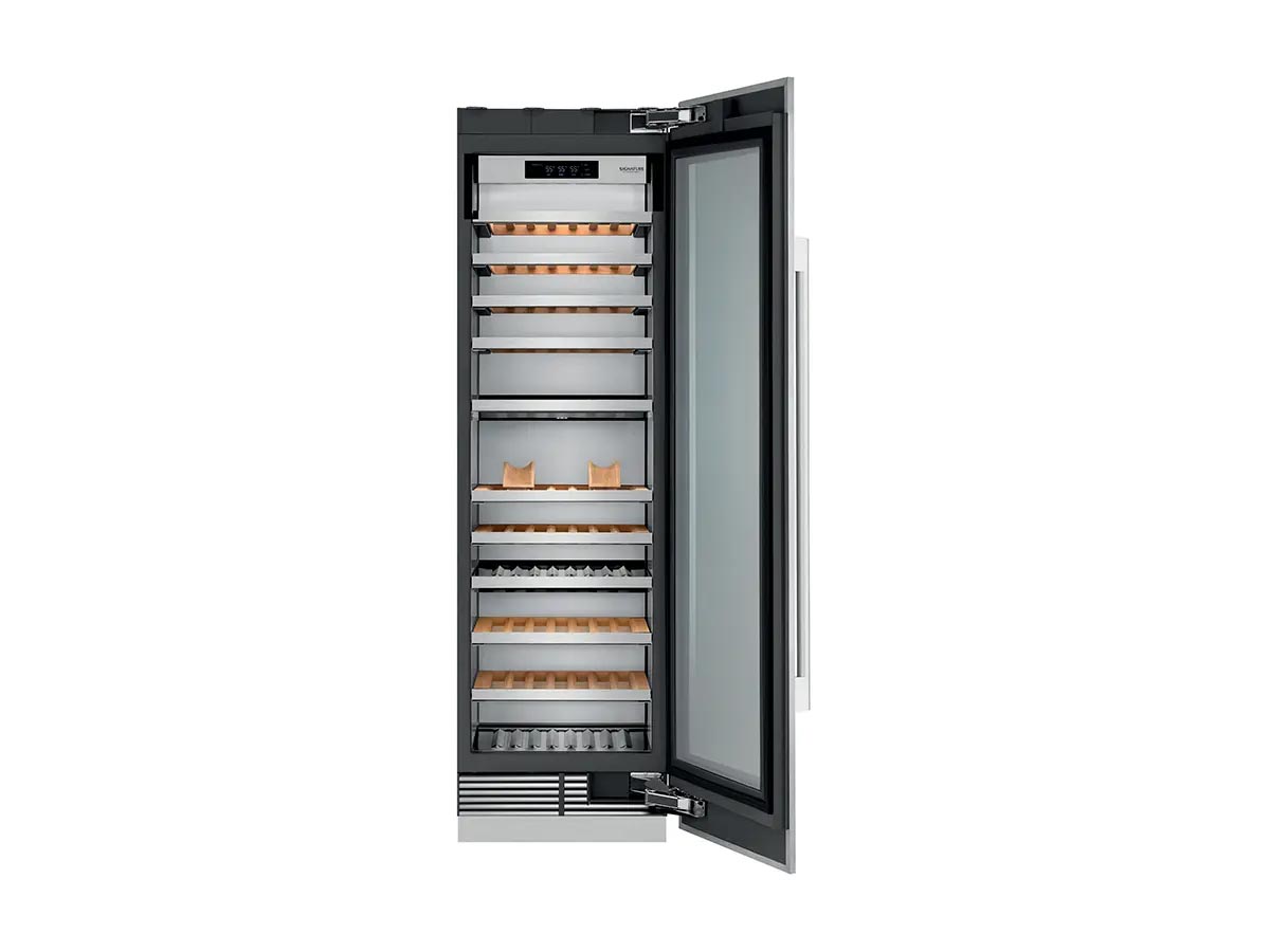 La cantina vino mostrata nel video si inserisce proprio in questa logica. Il modello da 24 pollici, pari a circa 60 cm, introduce tre zone regolabili per temperatura e umidità, ripiani in legno di faggio naturale, cerniera reversibile, connessione Wi-Fi e possibilità di personalizzazione della cornice in funzione del progetto cucina. Diventa così un esempio efficace della visione SKS: conservazione professionale, controllo da remoto e attenzione al dettaglio estetico.