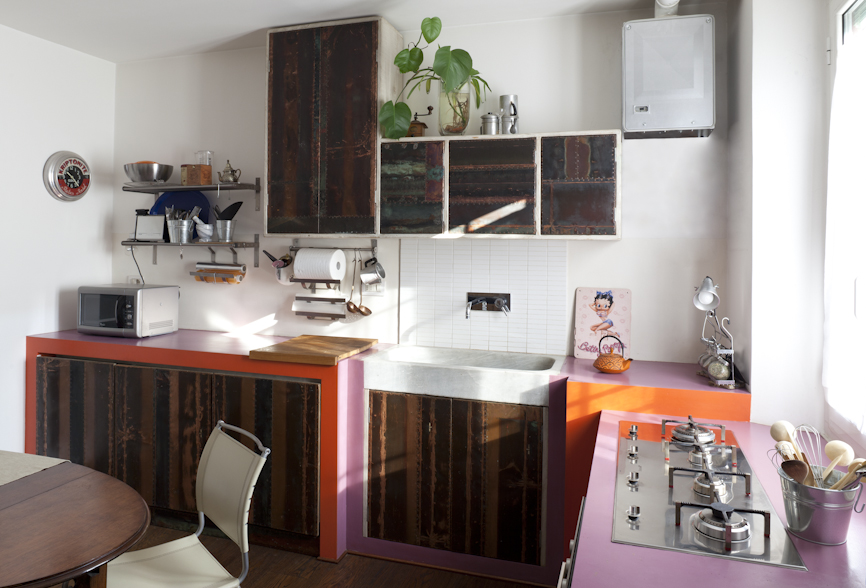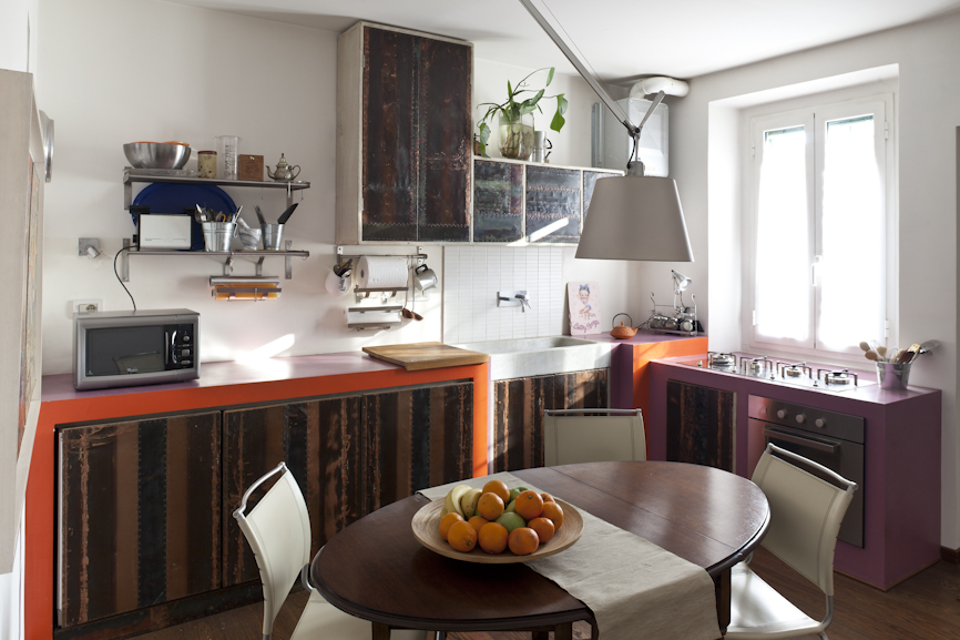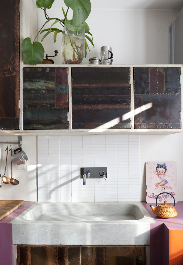 Anche nello studio delle finiture è stata fondamentale la sinergia delle diverse donne coinvolte nel progetto, dalla scelta dei materiali fino all’autocostruzione di alcuni elementi. La cucina è in muratura con sportelli e pensili realizzati su misura in legno, ferro e rame da Costanza Algranti.