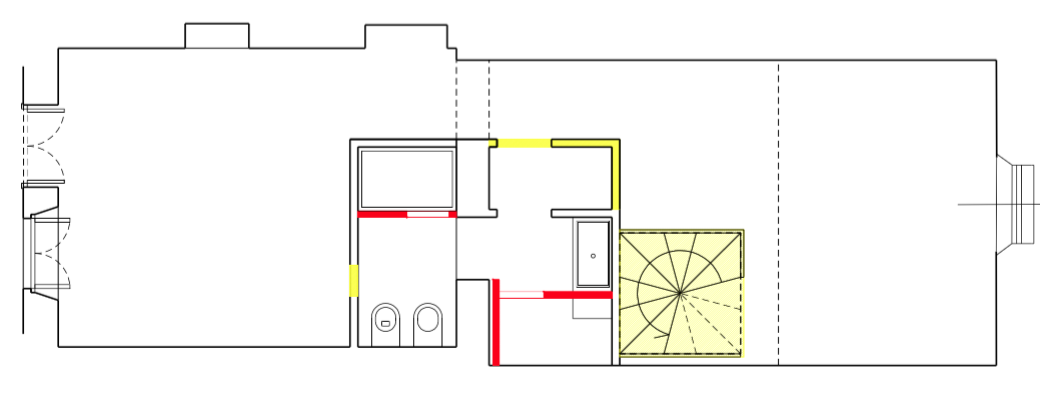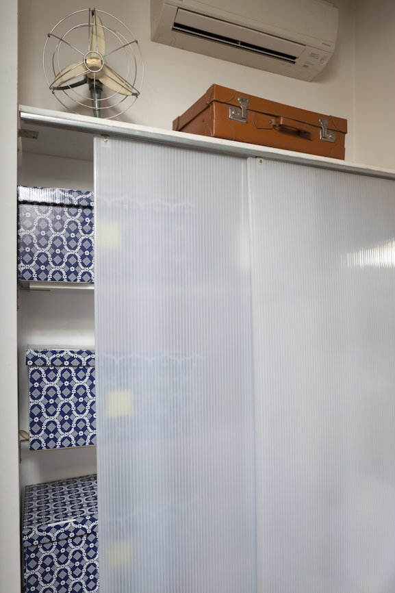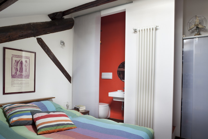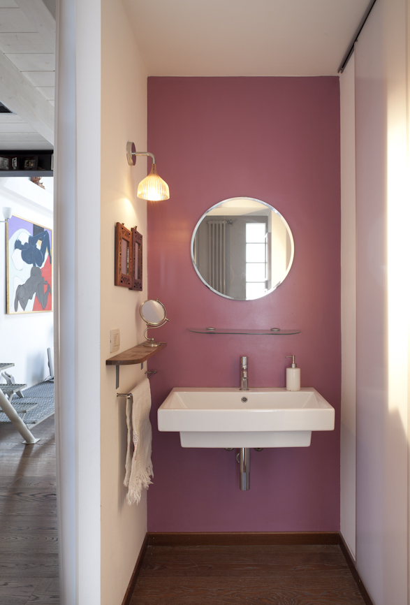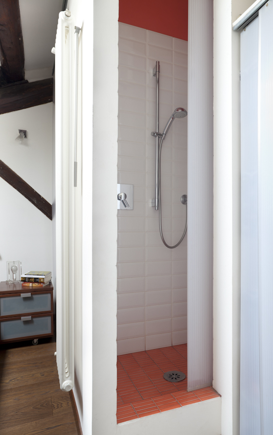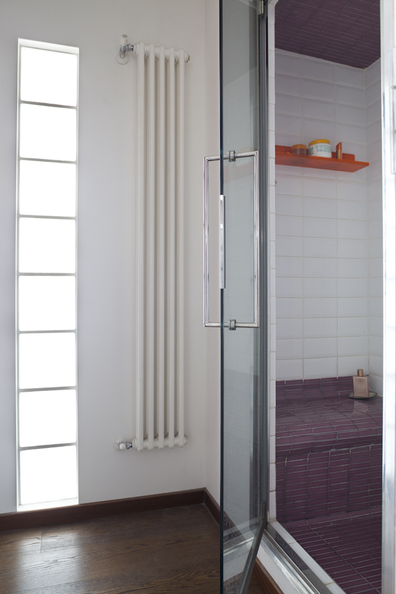 L’ampia doccia è stata trasformata in bagno turco, utilizzando  pannelli prefabbricati per l’isolamento delle murature, successivamente rivestiti con piastrelle, è stata montata una  porta a tenuta stagna e l’erogatore di vapore è stato collegato alla caldaia,  posta nel ripostiglio adiacente. Essendo locali privi di aperture sull’esterno è stata inserita nella muratura del bagno verso la cucina una fascia in vetrocemento che permette l’entrata della luce naturale e la porta dell’antibagno è stata pensata in materiale traslucido con un’interessante soluzione in autocostruzione.