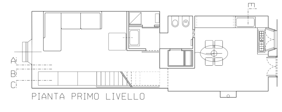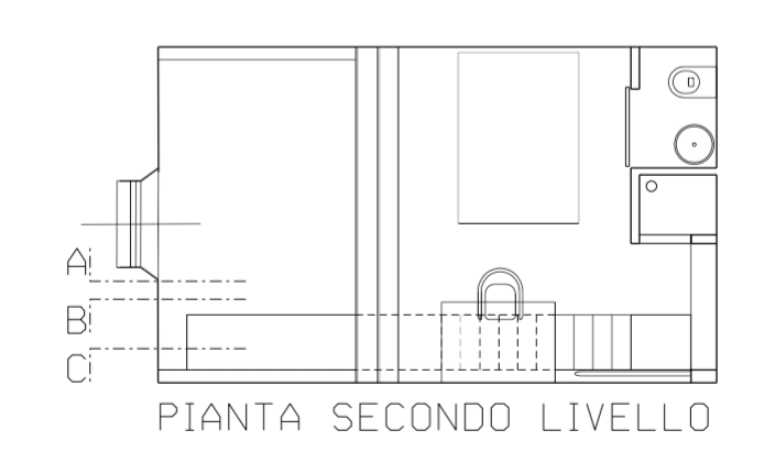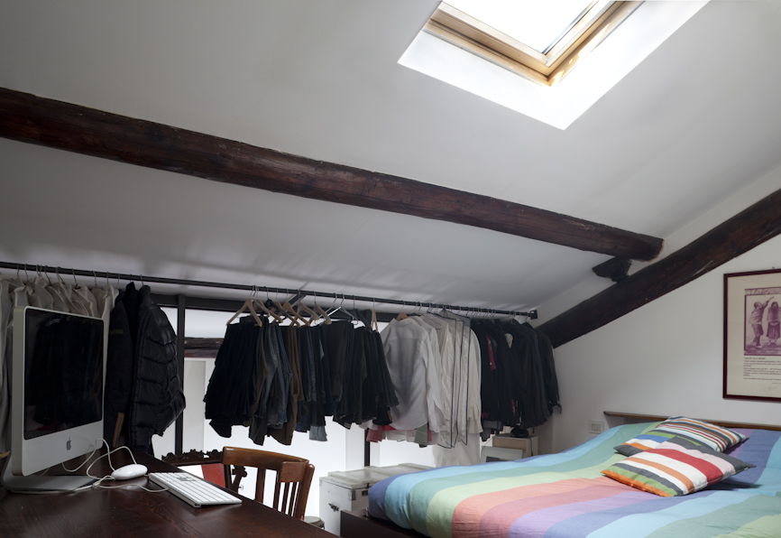 D295_06La scala a chiocciola esistente è stata sostituita con una scala-panca realizzata con tubolari in acciaio e pannelli di orso grill antitacco studiata appositamente per rispondere alle richieste di chi ora vive questo spazio. La prima alzata si allunga sulla parete retrostante e diviene una panca, un piano di appoggio o, con l’aggiunta di cuscini, si puo’ trasformare in divano ed in letto.