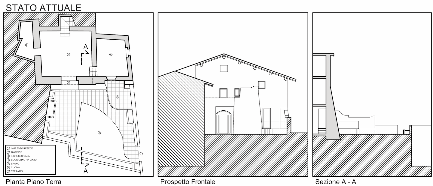 Nel giardino di pertinenza esterno di un’abitazione a torre (con piccole stanze sviluppate su tre piani fuori terra), il proprietario ha richiesto al progettista di integrare al massimo il piano terra con l’esterno.