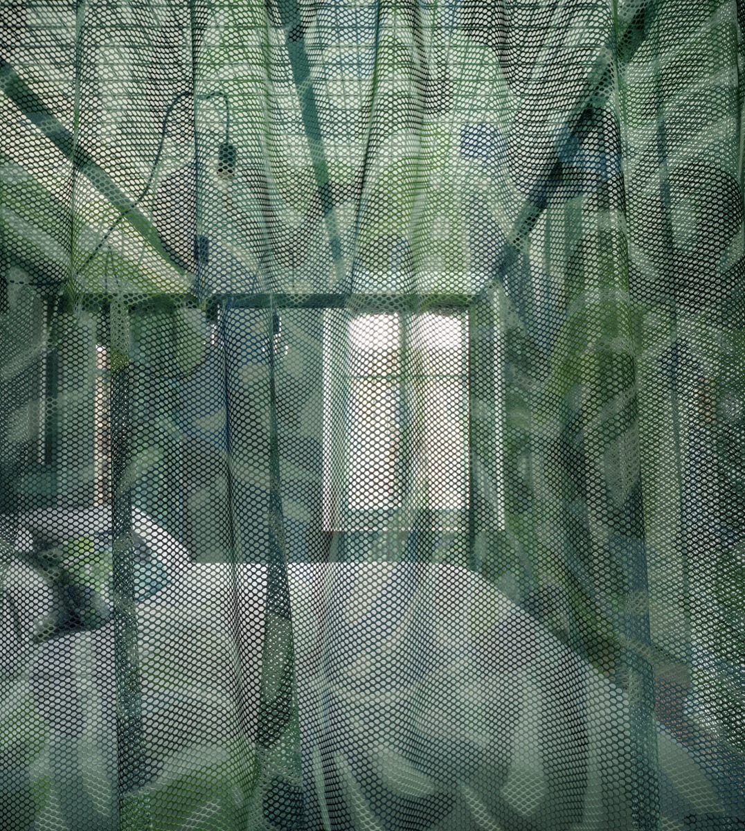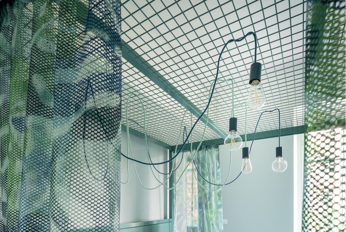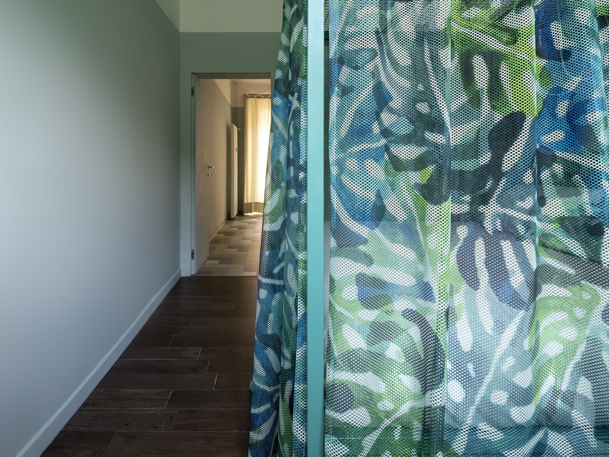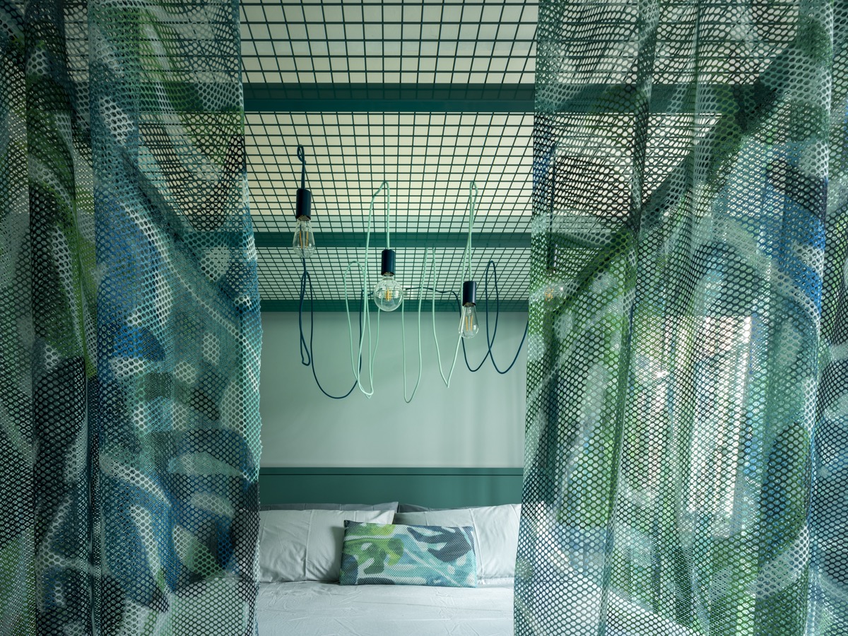 Ma la vera magia accade quando si chiudono le tende del baldacchino. Il tessuto traforato e stampato con motivi “foliage multicolor” di Monstera Deliciosa crea un gioco di luci e ombre che trasforma la camera in una suggestiva “giungla indoor”. Le lampade con filo, appese al soffitto del baldacchino in lamiera a rete, possono essere spostate a piacimento, rendendo lo spazio dinamico e sempre diverso.