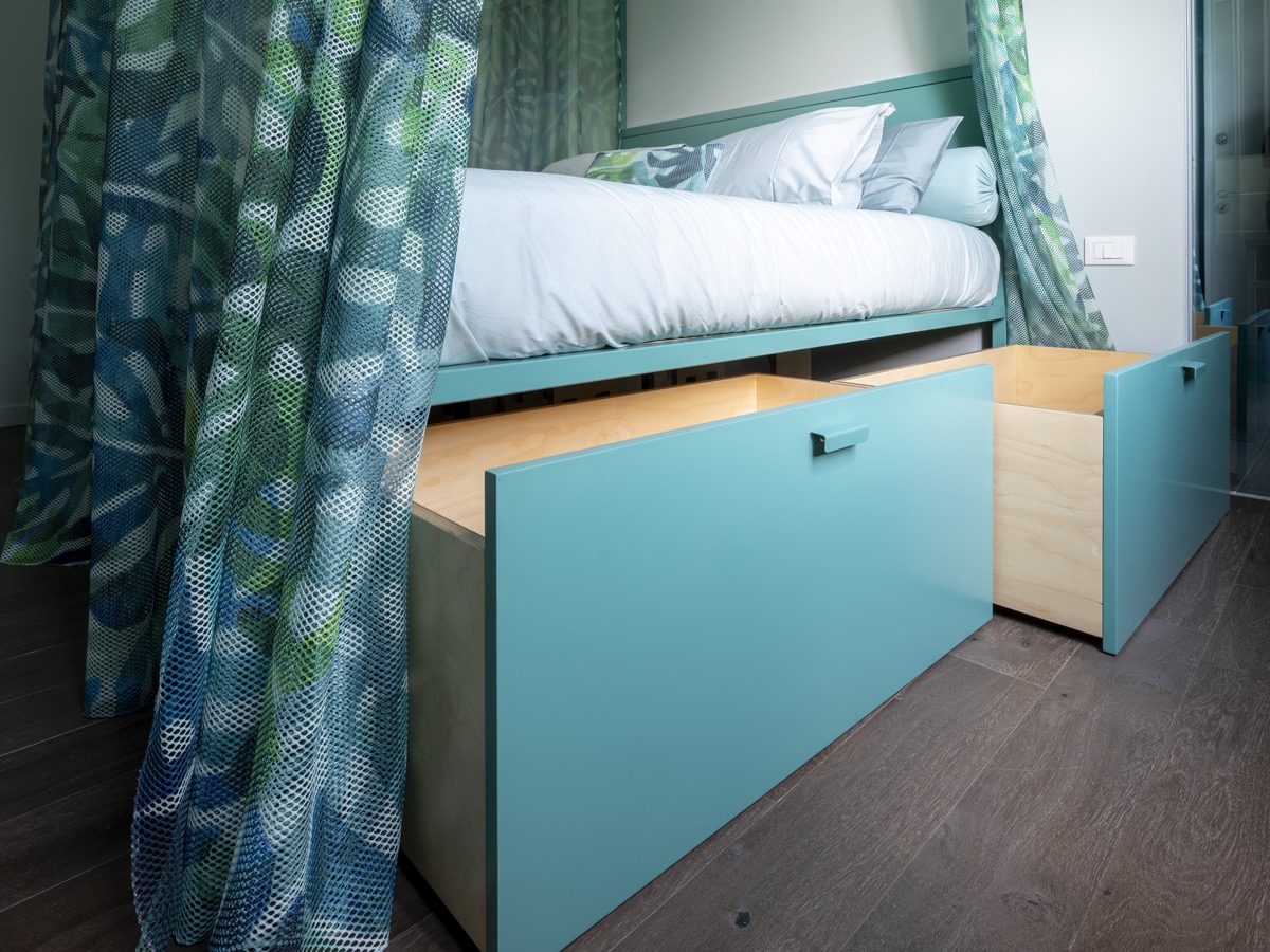 Il protagonista assoluto della zona notte è il letto a baldacchino, progettato su disegno dall’architetto: una struttura in ferro verniciato a polvere che diventa molto più di un semplice elemento d’arredo. È una “scatola colorata attrezzata” con quattro cassettoni a scomparsa sui lati, che risolve brillantemente il problema del contenimento in uno spazio ridotto.