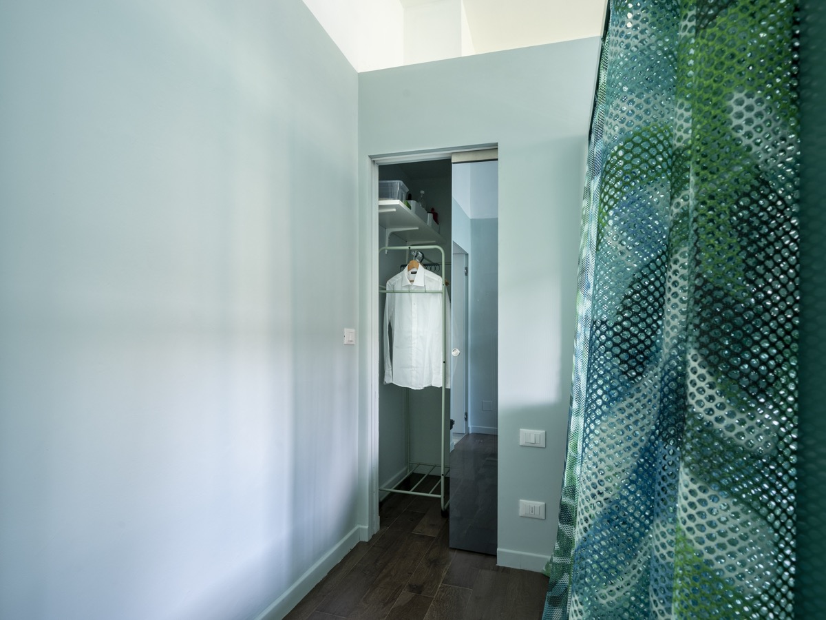 Gli scorrevoli in vetro temprato trasparente dell’antibagno e della doccia non solo ottimizzano gli spazi, ma lasciano filtrare la luce naturale amplificando la sensazione di ampiezza. Strategicamente posizionato vicino alla finestra, un grande specchio nel bagno riflette e moltiplica la luminosità naturale.