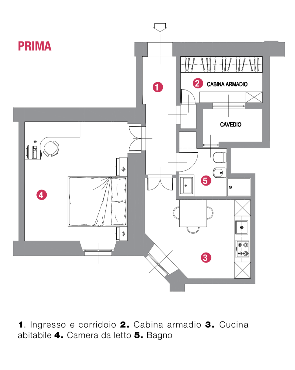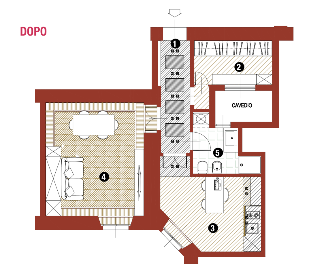 Infine, la ridistribuzione degli elementi e l’inversione del verso di apertura della porta in bagno, in modo che i sanitari non siano la prima cosa visibile quando si entra.