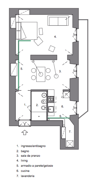 Il superamento della suddivisione in piccoli ambienti permette di sfruttare al meglio l’apporto di luce e aria dato dalle aperture che si trovano solo sul lato ovest dell’abitazione.