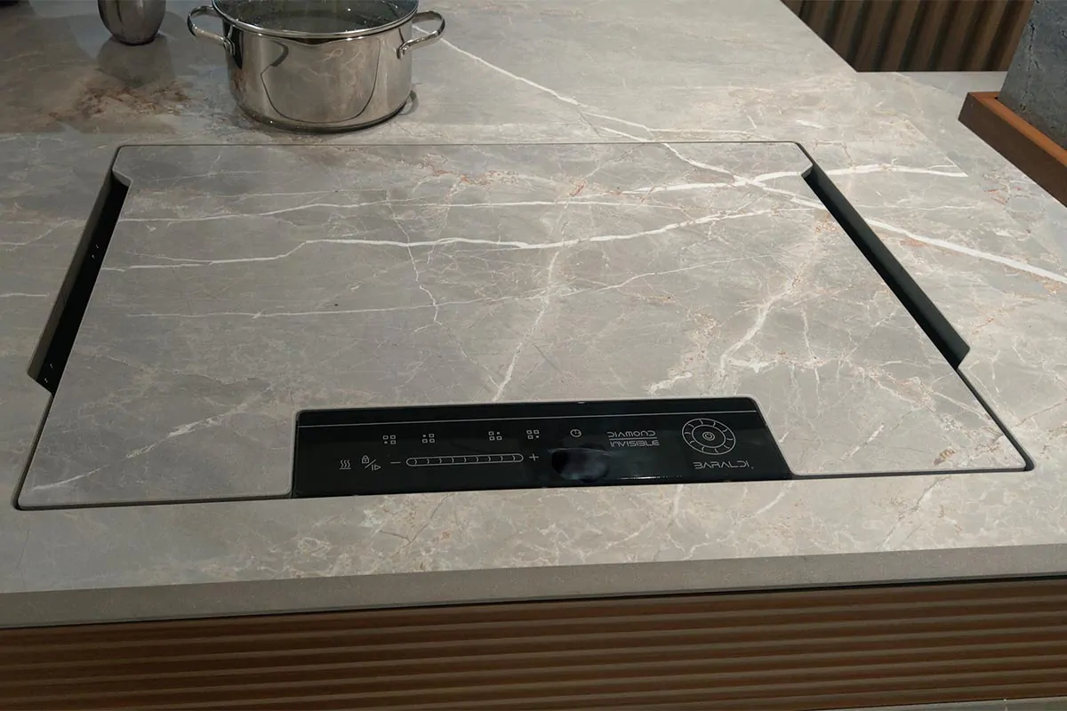 La tecnologia a induzione e la materia si fondono in un’unica superficie continua nei piani cottura Diamond Invisible e Phantom di Cappe Baraldi. In entrambe le soluzioni i piani a induzione sono completamente integrati nel gres porcellanato scomparendo alla vista in favore di un’unica e continua superficie del piano lavoro. Ogni dettaglio è pensato per offrire libertà progettuale, pulizia formale e prestazioni di alto livello.
