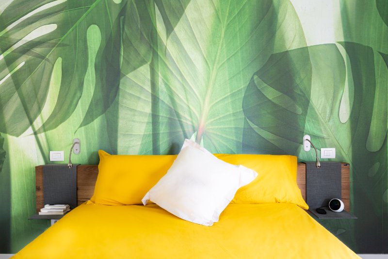 La zona notte padronale è dominata dal letto Fluttua di Lago con testiera Wildwood ridossato alla parete di fondo rivestita con la carta da parati Equatorial Jungle di Glamora, completato dalle lampade da lettura Lindos di Astro Lighting; lateralmente, un’armadiatura a tutta parete con sviluppo a L, realizzata su misura, incorpora la porta di accesso al bagno privato.