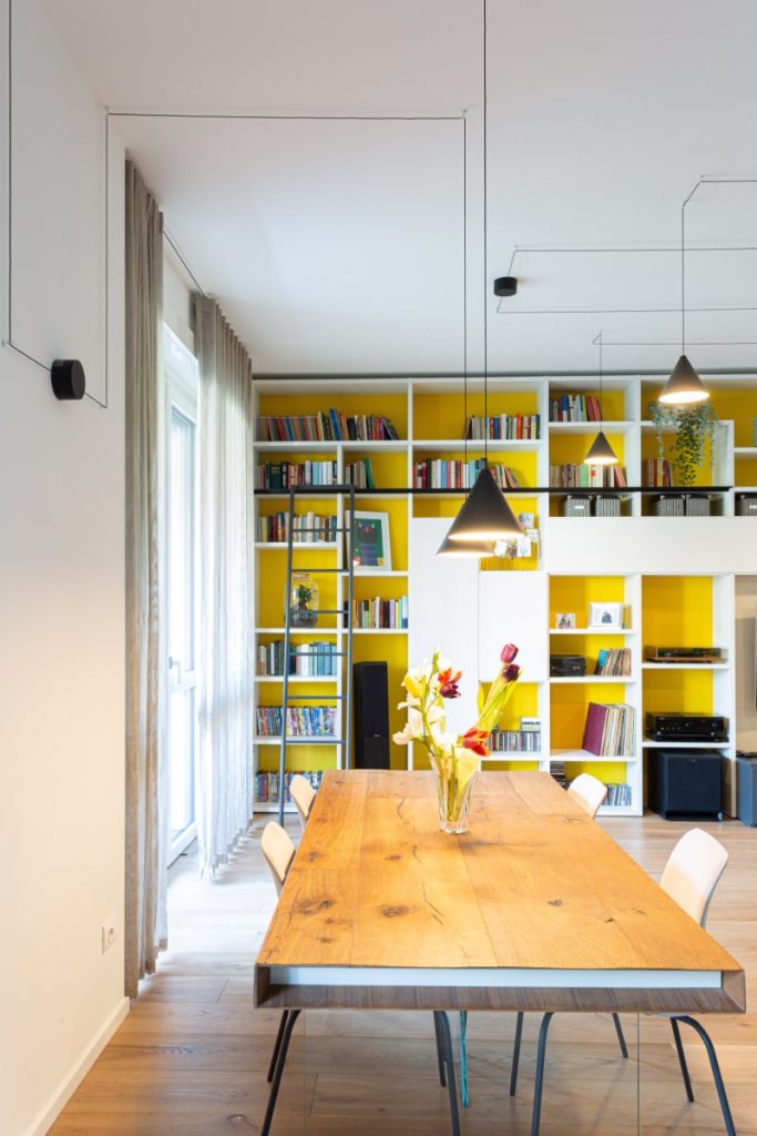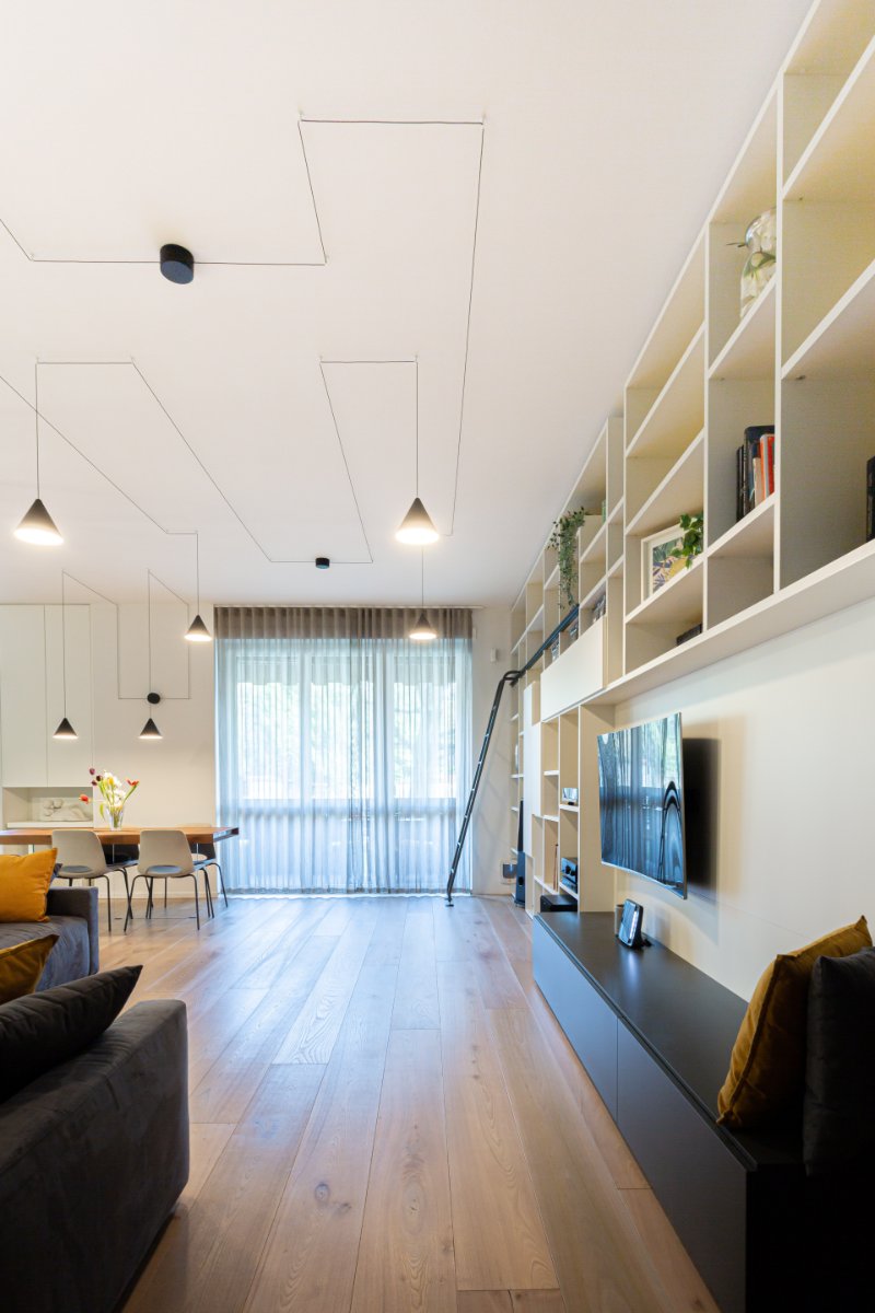Il sistema di sospensione si basa su un cavo coassiale da 12 metri molto sottile e rinforzato in Kevlar che, come un tratto di matita, disegna linee geometriche sulle superfici. Sempre di forma conica sono i diffusori delle sospensioni di Wever & Ducré che illuminano il tavolino tra i divani. Il parquet prefinito è in legno di olmo su multistrato di betulla (4+12 mm), scelta Rustica, finitura spazzolata, formato 2200/1200x230x16 mm.