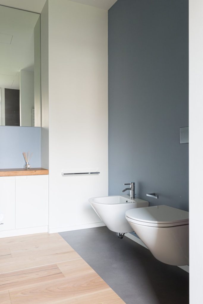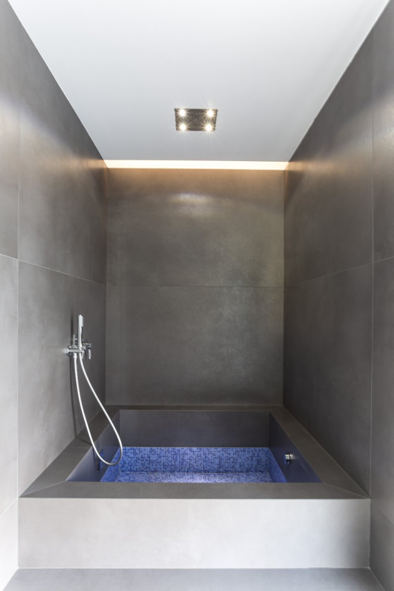 Una seconda fonte luminosa a led IP64 è inserita in una gola ricavata nel controsoffitto; la nicchia è rivestita con lastre di grande formato Ultra Resine color piombo di Ariostea, utilizzate anche per l’esterno della vasca e per pavimentare la banda sotto i sanitari Forty 3 di Globo.