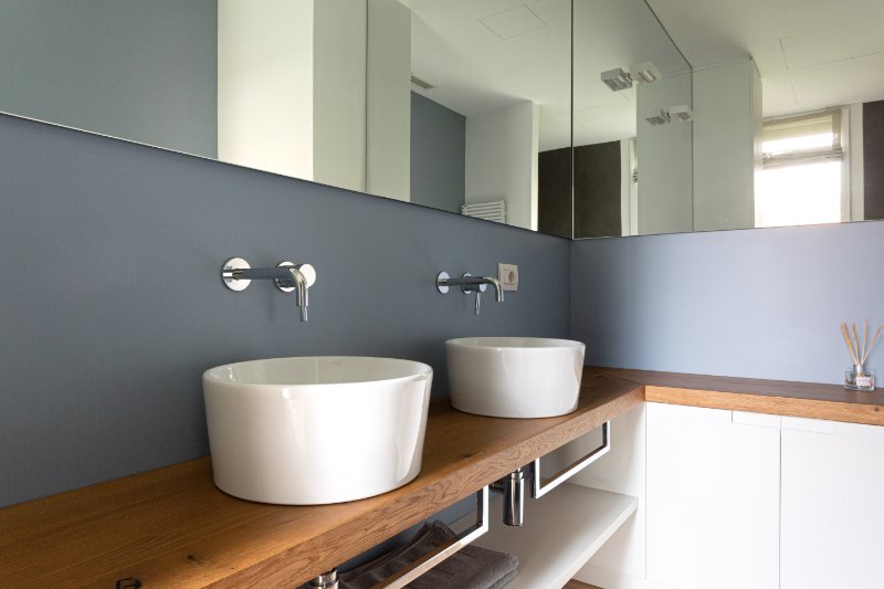 Della stessa gamma fanno parte i lavabi, appoggiati su una tavola impiallacciata rovere e rifinita in resina con gli stessi accorgimenti utilizzati per la penisola della cucina; la porzione di parete sovrastante è trattata con smalto opaco, per le rubinetterie è stata scelta la serie Pan di Zucchetti.