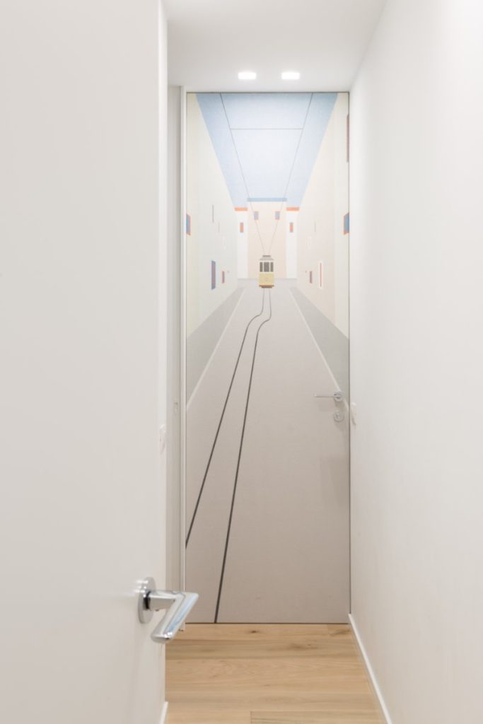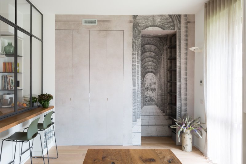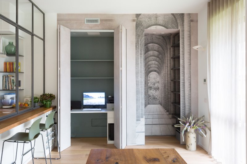 Trattandosi di uno spazio angusto, la porta in fondo al corridoio è stata rivestita con una carta da parati che facesse percepire una maggiore profondità (Fado di Wall&Decò).