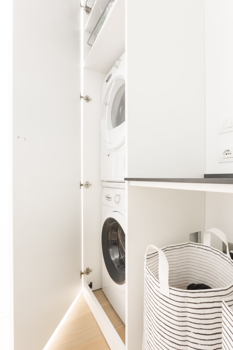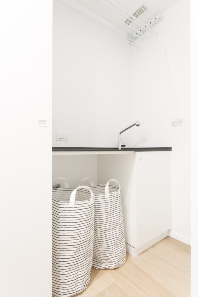 Anche quest’ultima è accessibile passando attraverso un’armadiatura che è in parte a servizio del corridoio e in parte della lavanderia stessa, completamente allestita con soluzioni su misura: lavatrice e asciugatrice in mobile a colonna, un piano in Fenix con un lavatoio incassato e sovrastato da una barra portagrucce, vari contenitori per cesti della biancheria e prodotti.