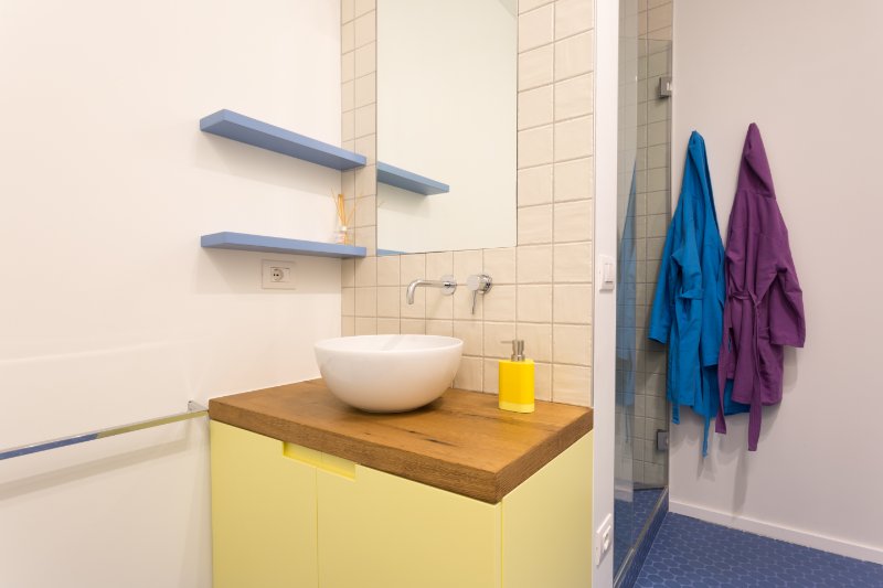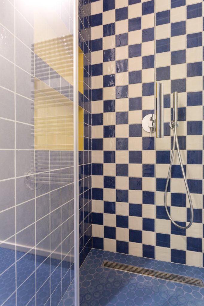 Per creare un ambiente vivace e giocoso, sono state scelte finiture originali: i rivestimenti sono realizzati con piastrelle Jolie 10×10 cm nei colori blu e avorio, mentre il mosaico del pavimento è XXS di Etruria, soggetto cerchio 5×5 cm, colore cobalto.