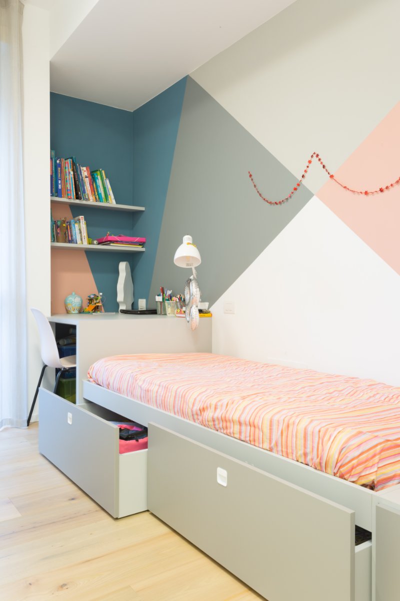 Separate dalla zona notte padronale, le due camerette dei figli si affacciano su un terrazzo condiviso e sono servite da un bagno progettato su misura per loro.