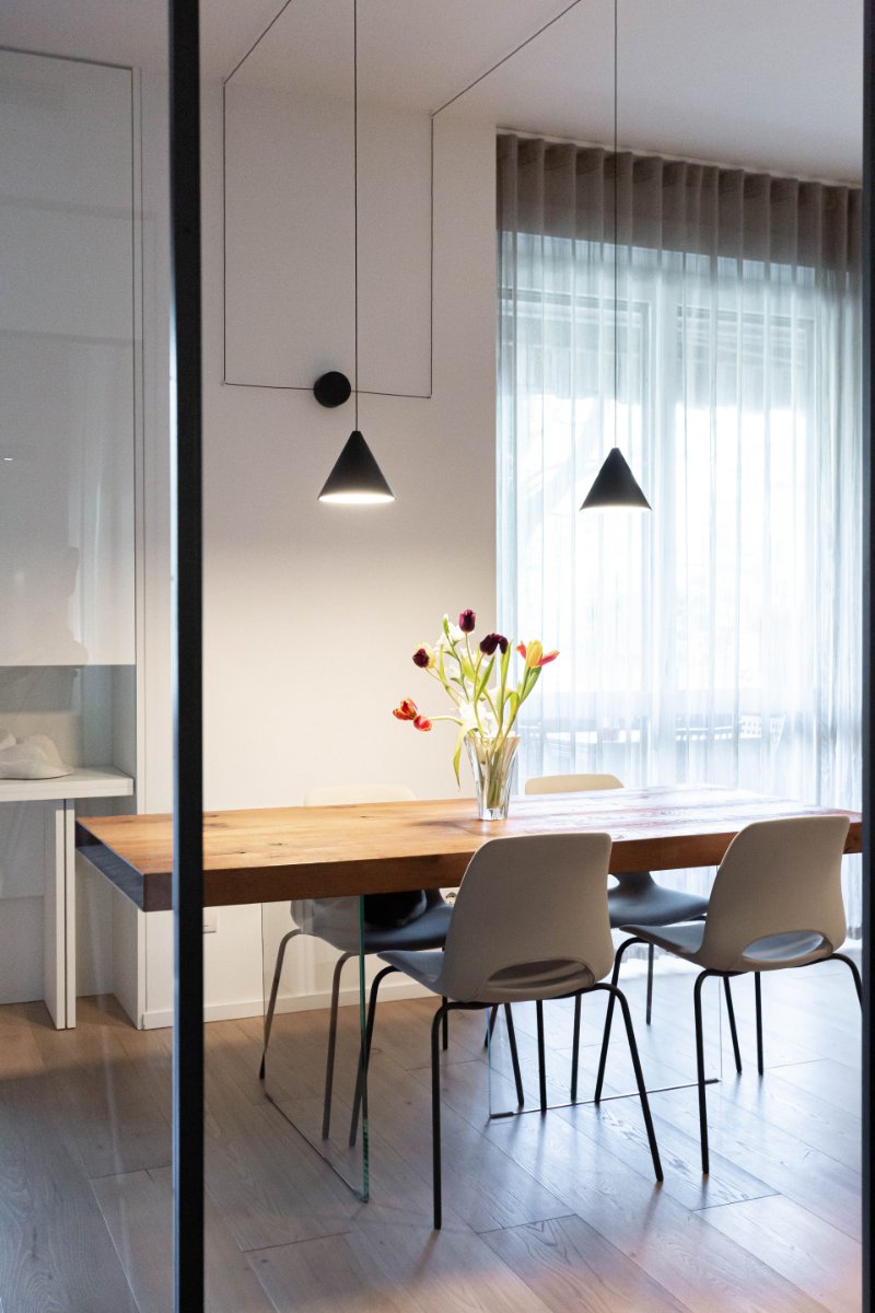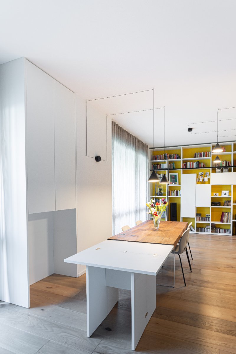 In questo appartamento anni ’70 al terzo piano di un condominio nella zona del Parco di Monza non c’era praticamente nulla da salvare della precedente configurazione: ambienti distribuiti attorno a un corridoio cupo che zigzagava tra le stanze, la cucina lontana dal soggiorno, quest’ultimo a pianta rettangolare, circa 30 m2, con una sola portafinestra in fondo a fronte di una superficie della casa di poco più di 120 m2, oltre a due balconi di 4 e 20 m2.