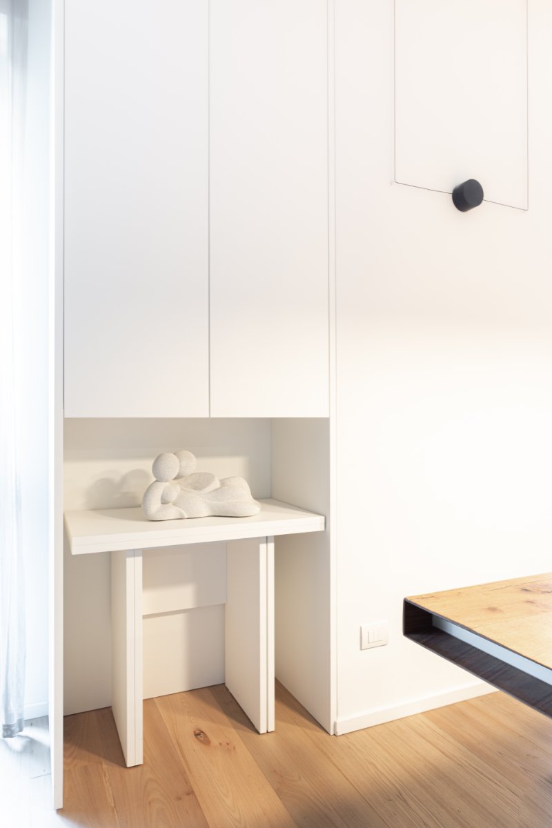 Due scaffalature poste ai lati della porta rasomuro della camera padronale, collegate da un ribassamento, creano un vestibolo che mitiga la percezione dell’accesso agli spazi privati. Questa variazione di profondità è stata estesa lateralmente fino alla cucina, generando una nicchia in cui è stata predisposta una postazione di lavoro, nascosta da due coppie di ante filomuro con apertura a libro.