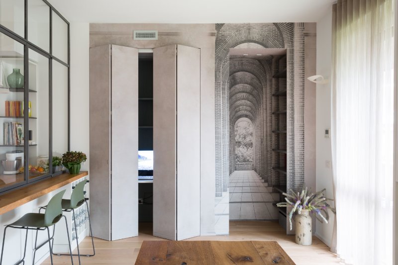 La carta da parati Linosa di Glamora si è rivelata il soggetto ottimale per rivestire l’intero fronte, applicando la parte “neutra” del decoro alla porzione di parete che nasconde zona studio, mentre il soggetto in prospettiva, con i dovuti adattamenti al taglio, è stato utilizzato per la cornice attorno al varco e la porta sul fondo.