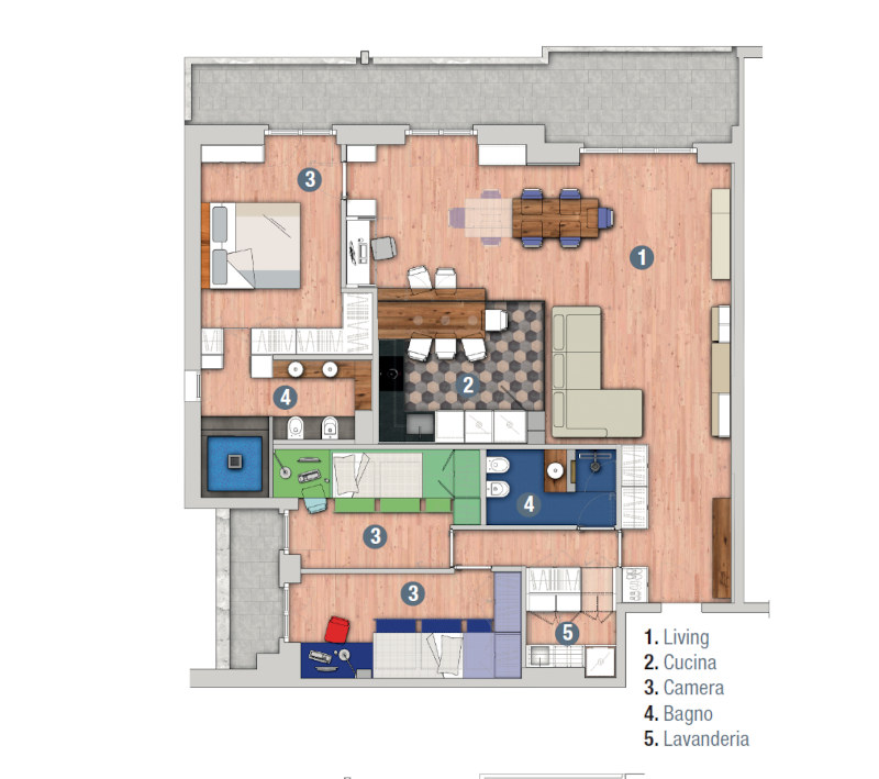 Il desiderio dei proprietari, una famiglia di 4 persone, era di avere una zona giorno il più possibile aperta, collegata alla cucina ma separata da essa; serviva una zona notte per i figli, ben distinta da quella padronale. Bisognava poi ricavare una postazione studio-lavoro in poco spazio e nascondibile, una lavanderia, tante soluzioni contenitive distribuite in più zone e poco invasive, introdurre novità e freschezza quanto a finiture e materiali.