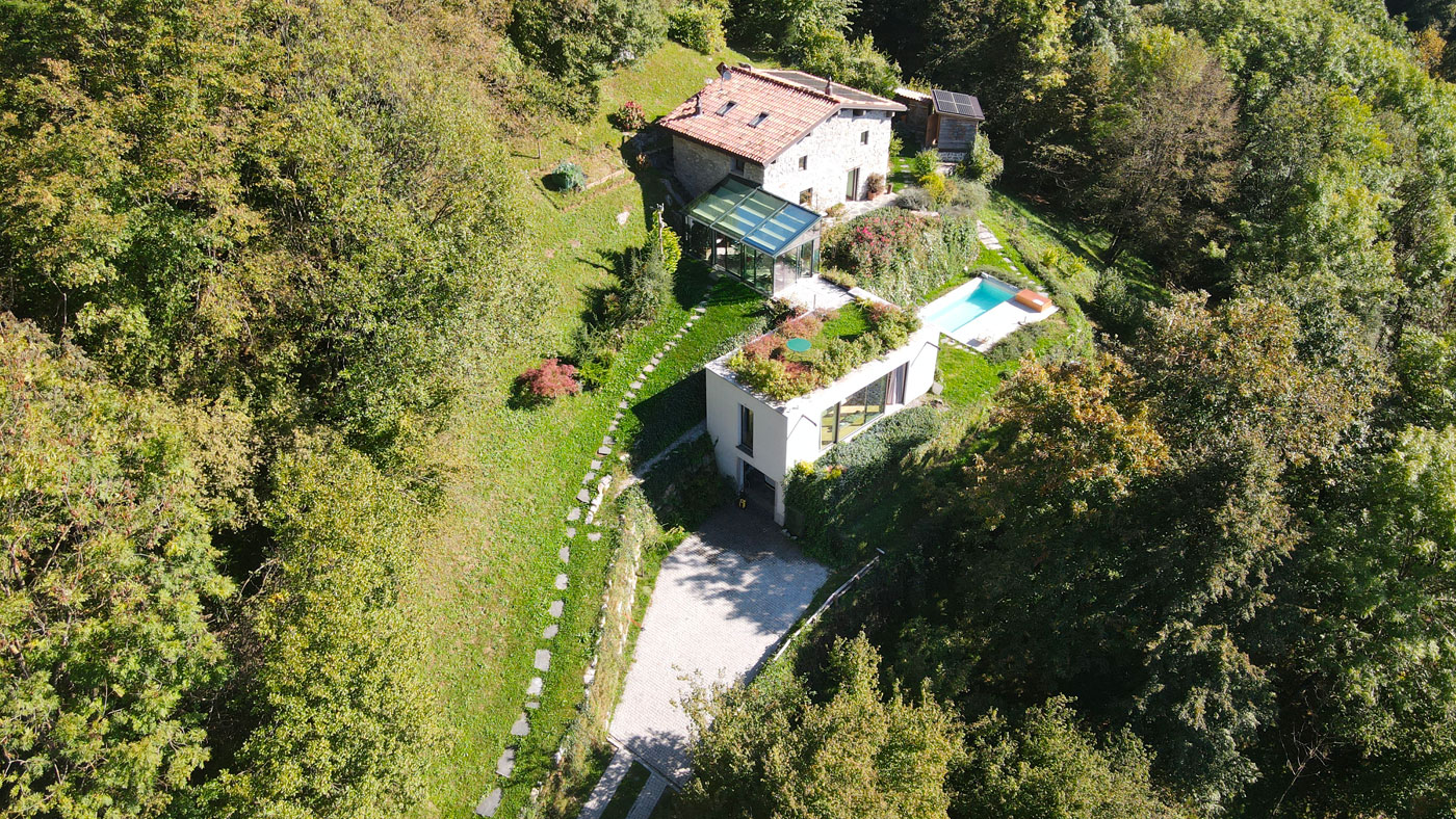 Il rustico è stato recuperato mantenendo l’aspetto esterno con le caratteristiche murature in pietra a vista, mentre l’ampliamento, su due piani, è collocato verso valle, parzialmente interrato e ideato con una copertura verde per impattare il meno possibile sul paesaggio.