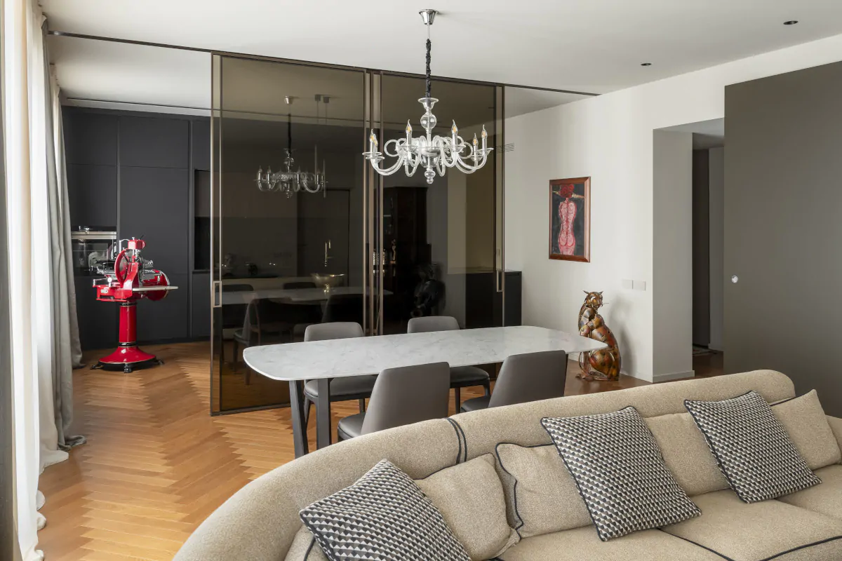 Per ricalibrarne le proporzioni, senza chiuderlo, gli architetti hanno delineato la cucina con diaframmi trasparenti. Quattro pannelli a tutt’altezza con telaio metallico e vetro fumè nei toni del grigio disegnano la zona: i pannelli, alti 2,80 metri e larghi 1,25, scorrono con un binario incassato a soffitto lasciando inalterato il pavimento in legno. Per rendere possibile la soluzione è stata incassata nel controsoffitto in cartongesso e agganciata ai due muri laterali una putrella metallica sui cui è stato agganciato il binario di scorrimento.