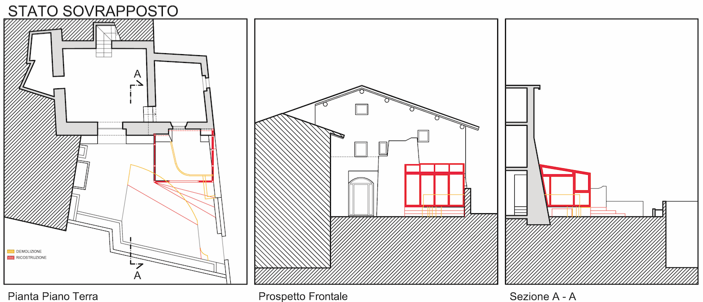 Nel giardino di pertinenza esterno di un’abitazione a torre (con piccole stanze sviluppate su tre piani fuori terra), il proprietario ha richiesto al progettista di integrare al massimo il piano terra con l’esterno.